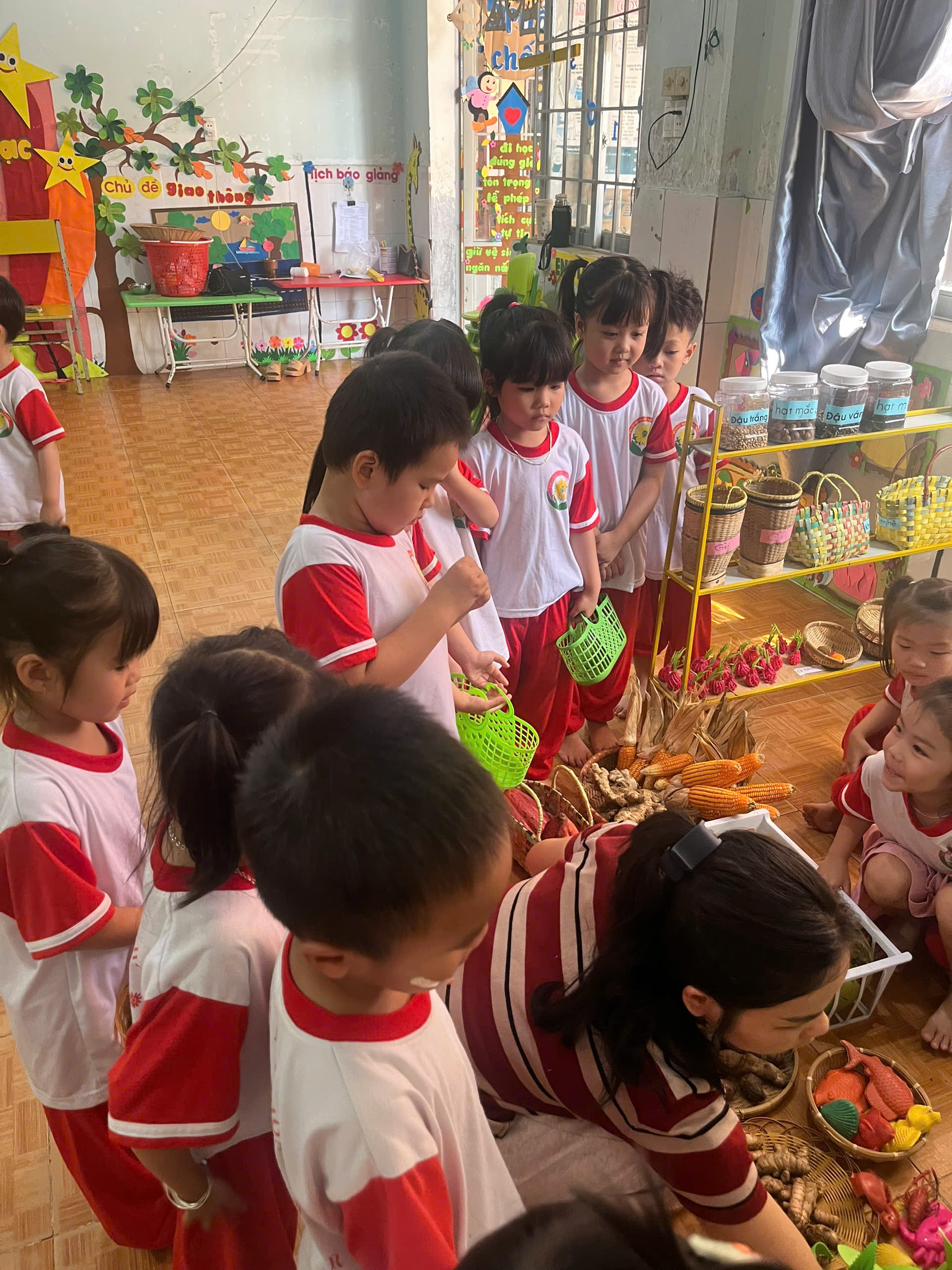 • Trẻ phân loại thực phẩm theo nhóm: rau củ, trái cây, đồ khô.