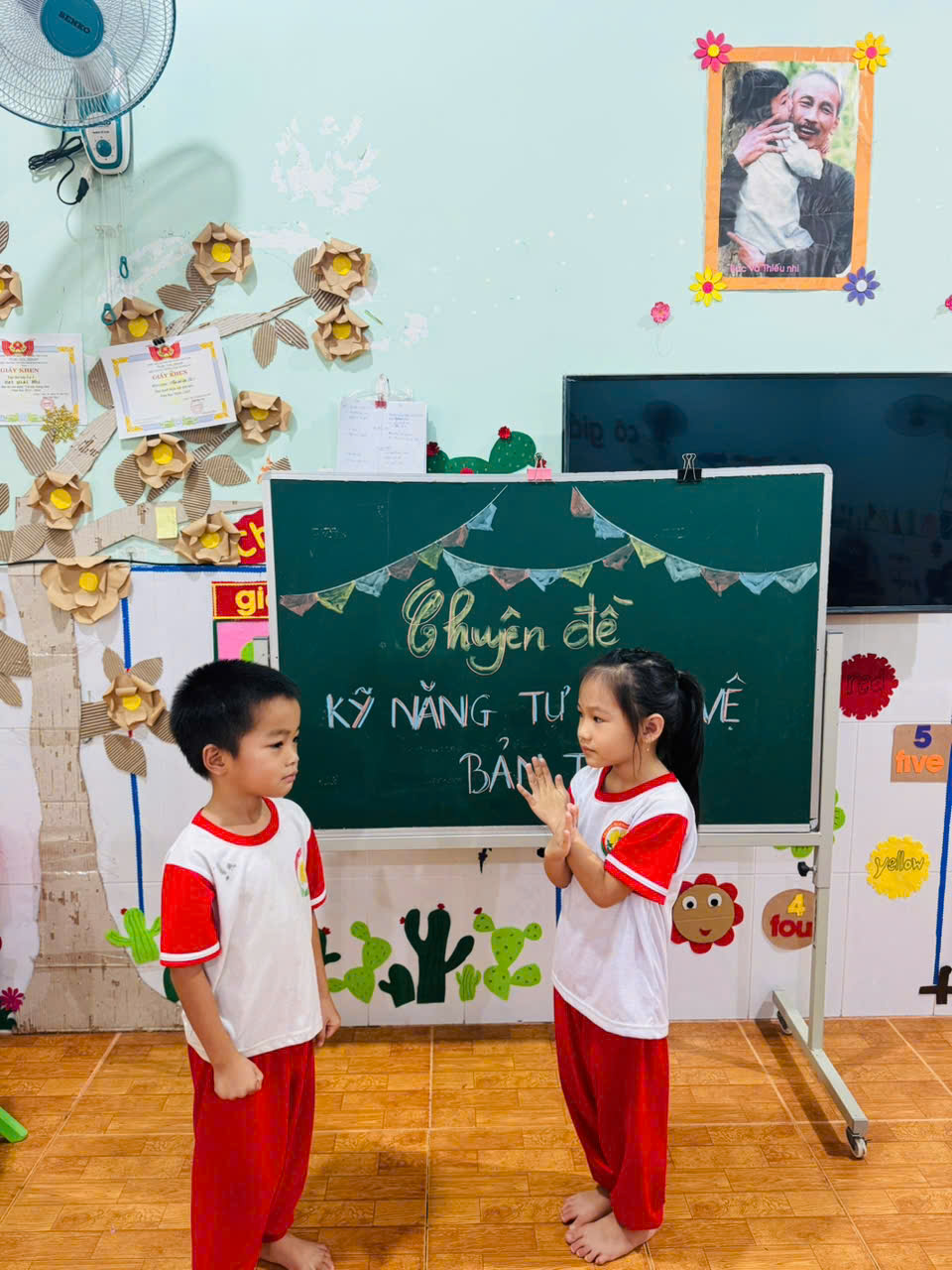 Kỹ năng bảo vệ bản thân là mức độ hiểu biết, khả năng ứng biến và hành động phù hợp của một người nào đó trước sự việc, tình huống, đối tượng xung quanh mình. Đây là kỹ năng rất quan trọng của cuộc sống, trẻ em nên được dạy khi từ nhỏ. Ở trường mầm non các con được dạy bảo vệ vùng riêng tư( miệng, ngực, mông, vùng giữa 2 đùi), thiết lập ranh giới cá nhân rõ ràng, học cách nói ” Không” và phản ứng ngay lập tức, cùng kể lại cho người lớn đáng tin để nhận sự giúp đỡ, đồng thời giữ khoảng cách an toàn và tin vào cảm giác của bản thân.